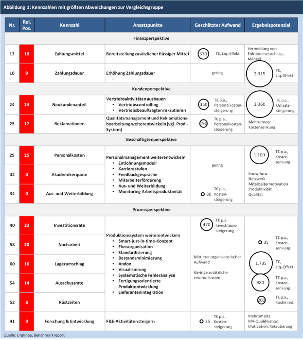 Das Benchmarking für den mittelständischen Kunststoffverarbeiter ergab, dass von den etwa 70 analysierten Kennzahlen insgesamt 13 ein besonders hohes Verbesserungspotenzial signalisierten mit einer relativen Position[2] von höchstens 25, womit nur 25 %, oder entsprechend weniger, aller Unternehmen in der Vergleichsgruppe einen schlechteren Wert aufwiesen als das Unternehmen.