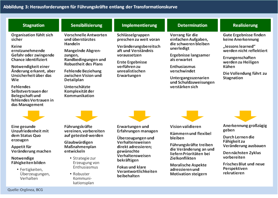 Nach einer Phase von Stagnation und Unzufriedenheit beschließt die Unternehmensführung, einen Wandel herbeizuführen. In der folgenden Sensibilisierung werden zunehmend mehr Führungskräfte in Planung und Kommunikation involviert. Dabei soll eine Unzufriedenheit mit dem Status Quo erzeugt und der Appetit für Veränderungen geweckt werden. Bislang fehlende Fähigkeiten, auch in Überzeugungen und Verhalten, werden weiterentwickelt. Dies sorgt für Begeisterung, aber auch für Skepsis in der Belegschaft. Glaubwürdigkeit und Vorbildcharakter der Führungskräfte haben eine hohe Bedeutung, um eine kritische Masse an Veränderungsbereitschaft zu erreichen. In der anschließenden Implementierung werden immer mehr Beschäftigte in allen Unternehmensteilen einbezogen. Wichtig sind Erwartungsmanagement und die andauernde Fokussierung auf die Umsetzung der Maßnahmen mit den Verantwortlichen. Erste Erfolge sorgen für eine positive Verstärkung der Veränderungsbereitschaft. Dies kann zu unrealistischen Erwartungen führen, die dann im Anschluss enttäuscht werden. Damit verschwindet der vormalige Enthusiasmus. In der folgenden Phase der Determination ist entscheidend, diese Konflikte, Reibereien und auftretenden Fehler zu adressieren. In dieser Phase müssen die Führungskräfte den Wandel weiter vorantreiben, die Belegschaft neu motivieren und mögliche Zielkonflikte entschärfen. Dieses schafft die Grundlage dafür, die identifizierten Potenziale auch tatsächlich zu realisieren. Anerkennung sollte dann großzügig gewährt werden und der nächste Veränderungszyklus bereits wieder ins Auge gefasst werden (vgl. Abbildung 3).